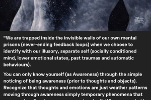 TEXT: “We are trapped inside the invisible walls of our own mental prisons (never-ending feedback loops) when we choose to identify with our illusory, separate self (socially conditioned mind, lower emotional states, past traumas and automatic behaviours).”