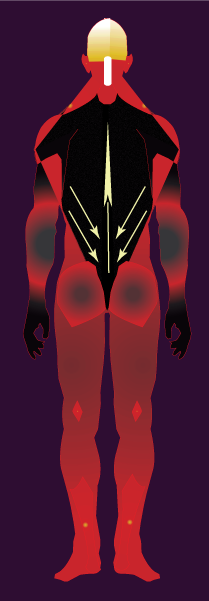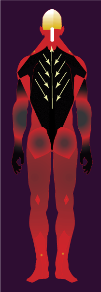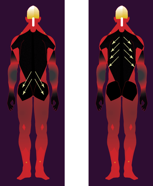 Apart from the central spinal passage, the sushumna nadi, those who do breath infusion should also attack the shards of energy which focalize to the center of the spine but which go downwards diagonally. Two patterns are illustrated below. In the first the attack pushes the energy into the lower spine downwards into the central channel and then force it upwards. In the second the effort is to push the energy behind the upper chest into the central channel and push that through the center upwards.